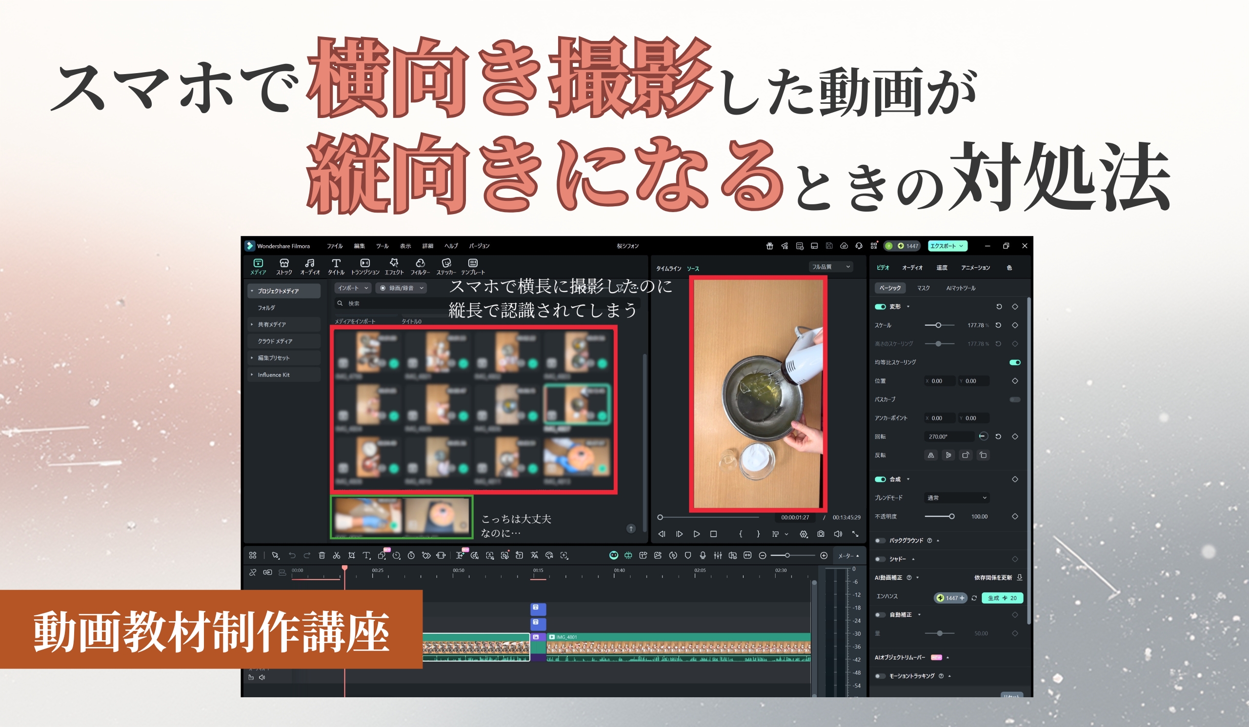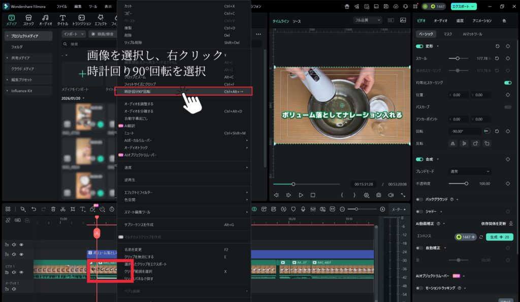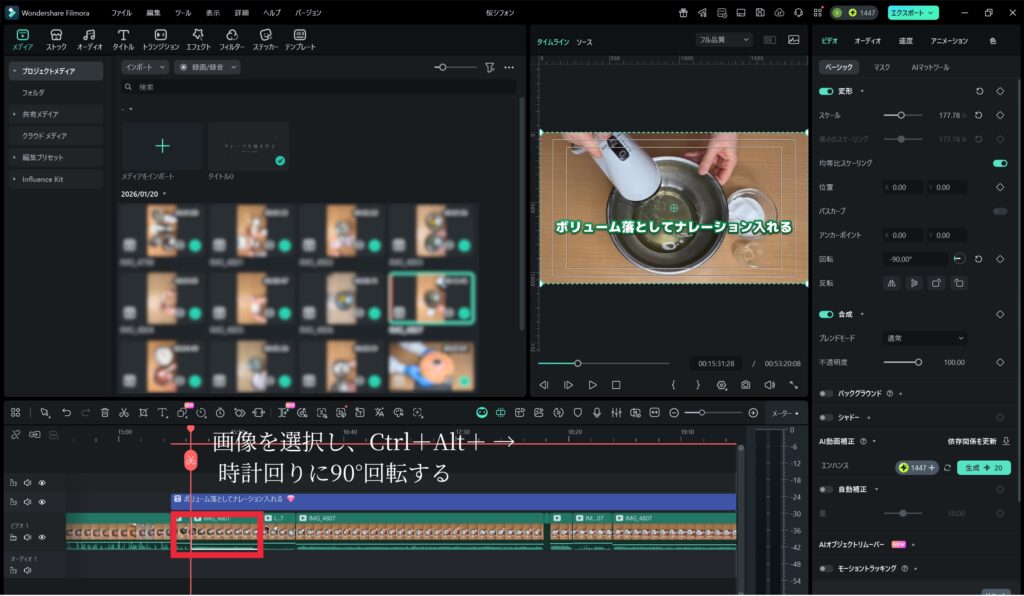 Filmoraの回転機能で正しい向きに修正できます。